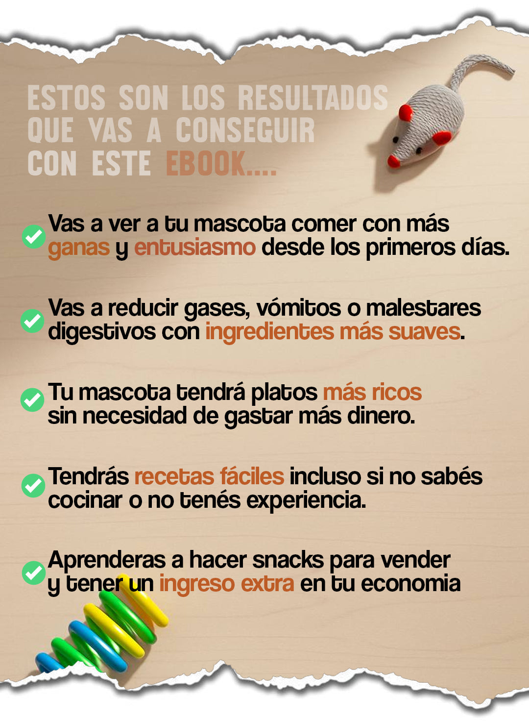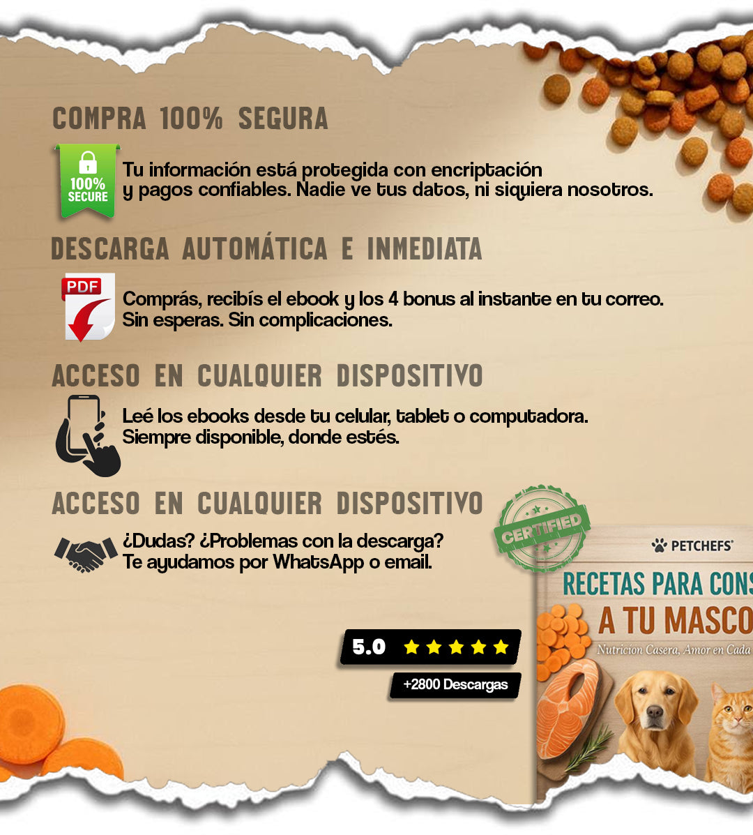 Con este ebook vas a aprender 10 recetas caseras, saludables y rápidas que podés preparar hoy mismo para mejorar la alimentación de tu mascota.
